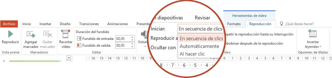 De manera predeterminada, en Presentación con diapositivas, el vídeo se reproduce como parte de la secuencia de clics. Eso significa que el vídeo se reproduce al hacer clic en cualquier lugar de la dispositiva para avanzar al siguiente paso (o al presionar la barra espaciadora, la tecla de dirección derecha u otra tecla que lleve al paso siguiente). Esta opción de Iniciar se denomina In Click Sequence (En secuencia de clics).