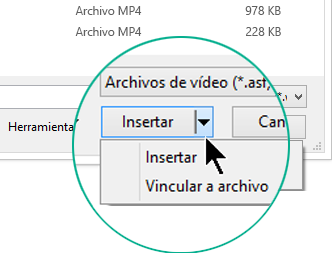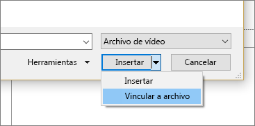 - En el cuadro Insertar vídeo, haga clic en el archivo con el que desea establecer el vínculo, haga clic en la flecha abajo situada junto al botón Insertar y luego en Vincular al archivo.